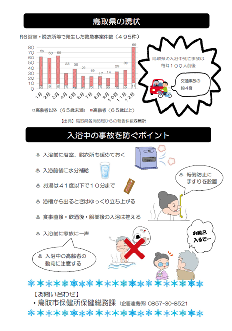 - 入浴中の事故により、鳥取県内で毎年100人前後の方が亡くなっておられます ( 交通事故死の約4倍に相当 ) 。
