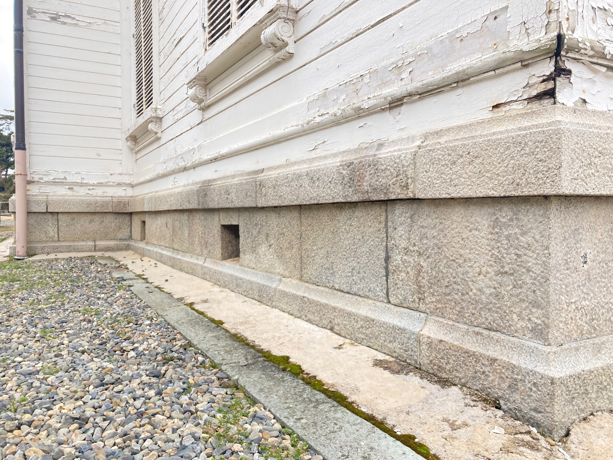 仁風閣は3段に積まれた花崗岩を基礎とし、上部構造を支えています(間仕切壁を支える基礎は凝灰岩積み)。これまで行ってきた調査にて、建物の土台と基礎を繋ぐアンカーボルトの存在は確認されたところですが、石どうしを緊結する細工は確認されませんでした。よって、今後、地震により石積基礎の遊離や脱落が発生した場合、上部構造に影響を与えるおそれがあるため、既存の石積基礎に鉄筋アンカーを打ち込み、側面よりコンクリートで支える補強を行います。なお、仁風閣が位置する久松公園は史跡として文化財指定されていることから、遺跡の損傷を避けるため、このたび設置する補強用のコンクリート基礎は、地面の掘削を伴わない「置基礎形式」とします。また、基礎設置にあたっては、明治時代より伝わる石積基礎や地盤面を保護するためシート養生したうえで型枠を設置し、コンクリートを流し込みます。いずれも床下におさまる補強となりますので、再開館時は来場者の目に触れることはありません。