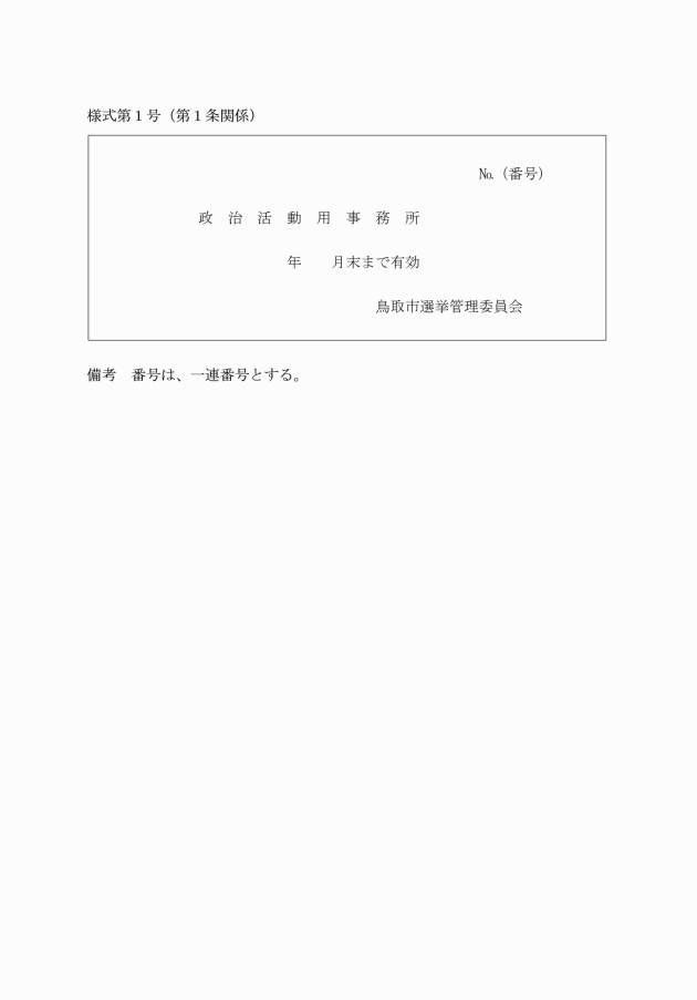 第1条 公職選挙法施行令(昭和25年政令第89号。以下「令」という。)第110条の5第4項の鳥取市選挙管理委員会(以下「委員会」という。)が交付する証票(以下「証票」という。)は、様式第1号による。