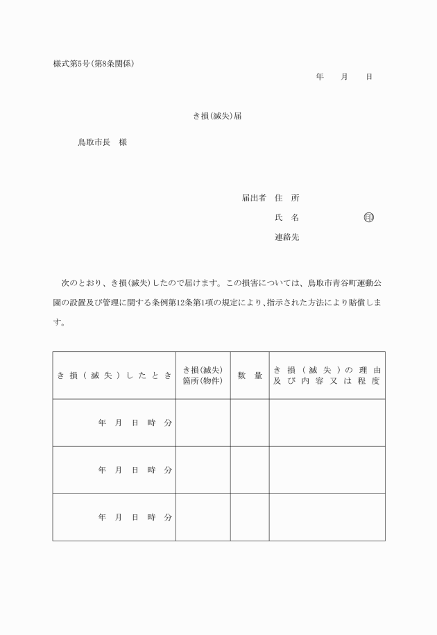 第8条 運動公園の施設、設備、器具等をき損し、又は滅失した者は、直ちにその理由を付して、き損(滅失)届(様式第5号)により市長に届け出なければならない。