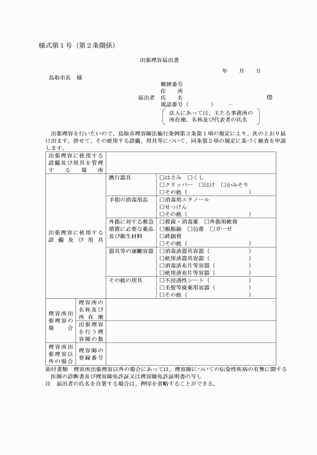 第1条 この規則は、理容師法(昭和22年法律第234号。以下「法」という。)、理容師法施行規則(平成10年厚生省令第4号。以下「省令」という。)及び鳥取市理容師法施行条例(平成29年鳥取市条例第81号。以下「条例」という。)の施行に関し、必要な事項を定めるものとする。