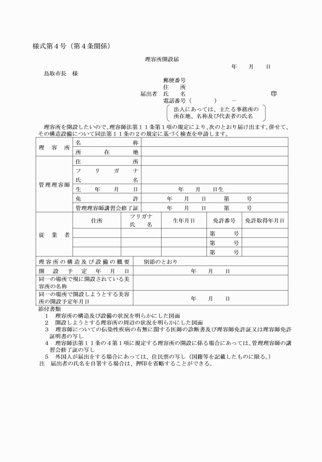 第4条 省令第19条第1項に規定する届出書は、理容所開設届(様式第4号)によるものとする。