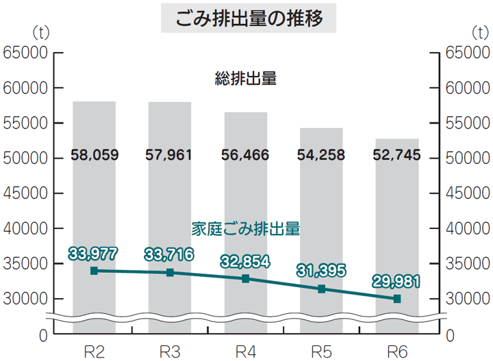 令和6年度の本市のごみ総排出量(家庭から出るごみと事業所から出るごみの合計)は52,745トンとなり、前年度の54,258トンから1,513トンの減量となりました。(前年度比約2.8パーセント減)