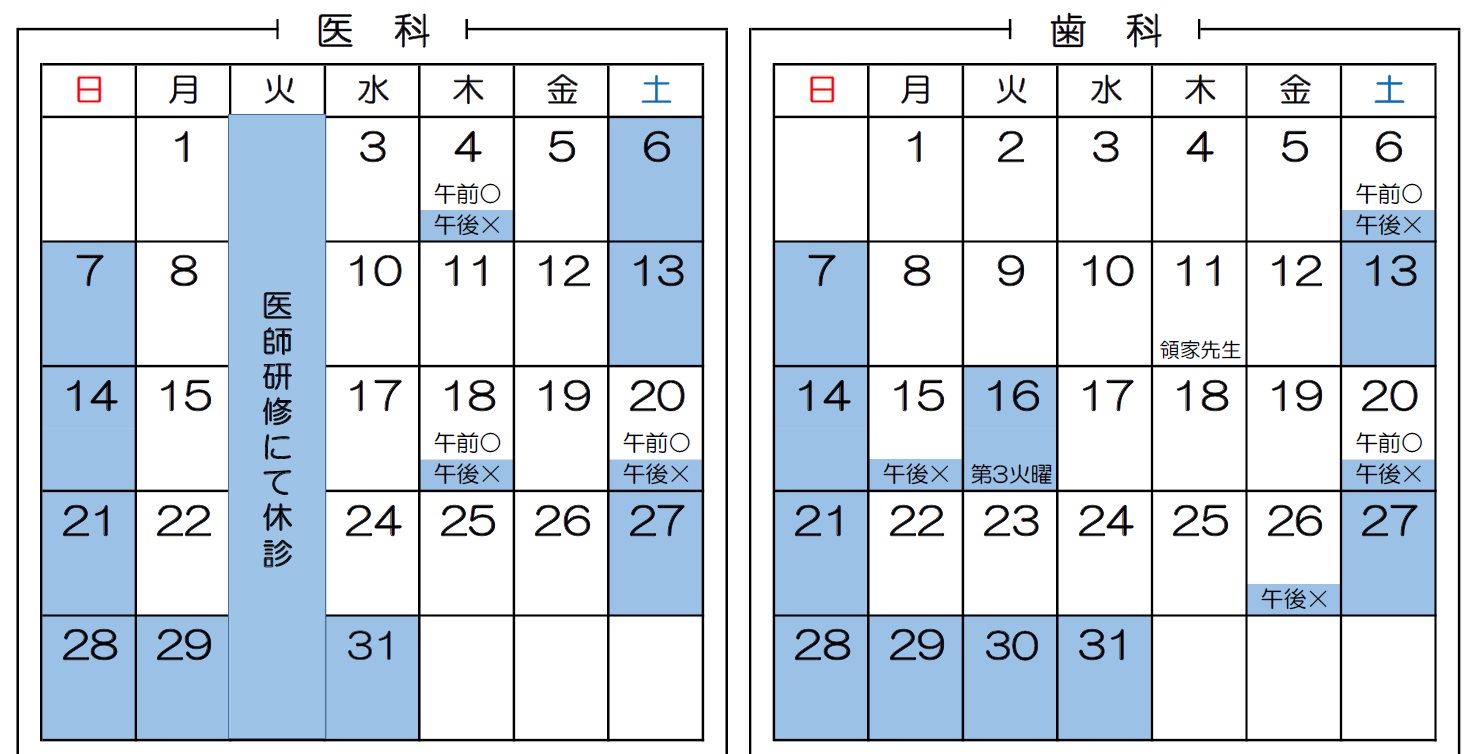 【医科休診日】 毎週火曜日/木曜日・土曜日(第1・3の午後)/土曜日(第2・4・5)/日曜/祝日/年末年始