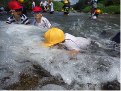 【全校で思いっきり楽しむ川遊び!】 地区を流れる曳田川で、思いっきり川遊びを楽しみます。きれいな水の中の生き物を探すのも楽しみの一つです。 |