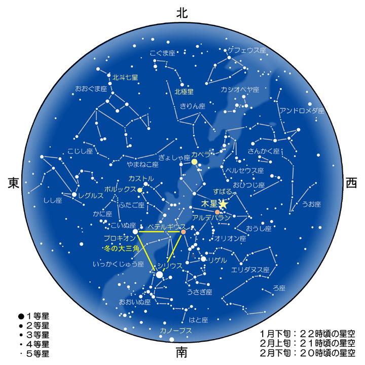 冬の夜空で目立つのは、すばるや、オリオン、大犬、小犬の冬の大三角を作る星達です。寒風が吹き抜けるとき、大きく瞬きながら地上を見つめ、自分を主張するようにも感じます。大陸からの高気圧が日本に張り出して来ると、日本海側では大雪、太平洋側ではカラカラに乾燥した風が吹きます。インフルエンザに注意しなくてはいけない季節。