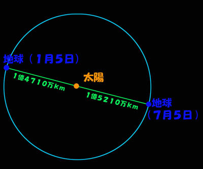 例えば、地球が今年太陽に最も近くなるのは1月5日03時で、その時の太陽からの距離は1億4710万km、そして最も遠くなるのは7月5日20時で1億5210万km。500万kmも変化するのですね。距離が変われば、見掛けの大きさも変わります。最も近い1月上旬は32分32秒角ですが、最も遠い7月上旬には31分28秒角にまで変化するのです。