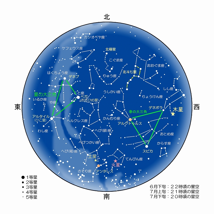 7月になると梅雨が明け夏への期待が高まる頃です。星空も東の空には七夕の星、そして夏の大三角が見えやすくなりました。「ベガ」「アルタイル」「デネブ」の3つの1等星で直角三角形を作ってみましょう。「木星」は西の空に低くなりましたが、「火星」と「土星」は南の空でよく見えます。2つの惑星の間には、「アンタレス」があります。「釣り針のような形」とも言われる「さそり座」を結んでみましょう。