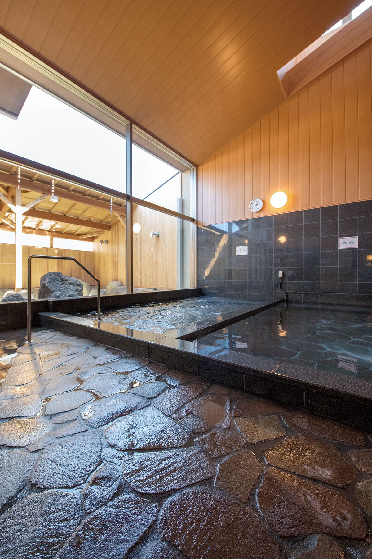 2種類の浴場「木風呂」、「岩風呂」があり、それぞれに露天風呂と打たせ湯が設けられています。
