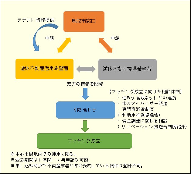 中心市街地における遊休不動産活用希望者の「遊休不動産活用希望情報」及び遊休不動産提供希望者が提供しようとする「遊休不動産情報」の登録、登録情報の公開並びにマッチングを行う制度です。