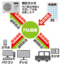 防災ラジオとは、災害時に本市が緊急情報を発信した際に、ラジオ局(FM鳥取)の電波を利用して、自動で起動する情報伝達機器です。