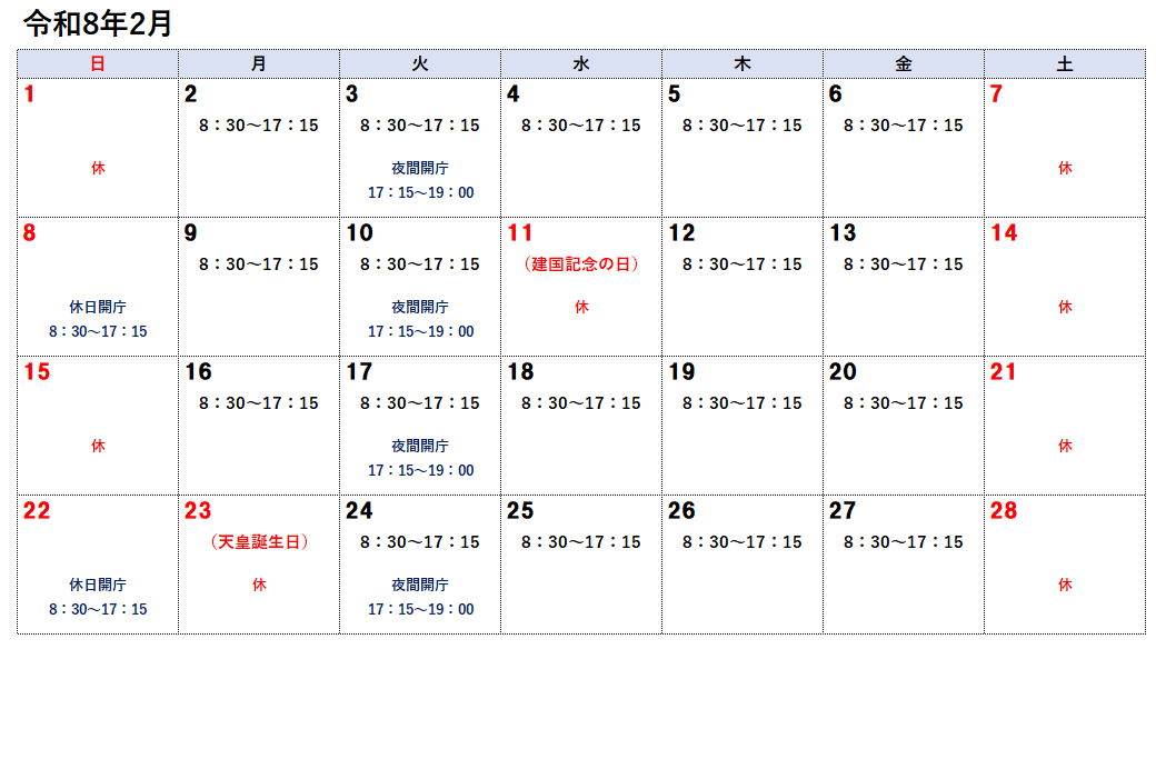 第2・第4 日曜日 午前8時30分 ~午後5時15分 (※祝日・年末年始を除く)