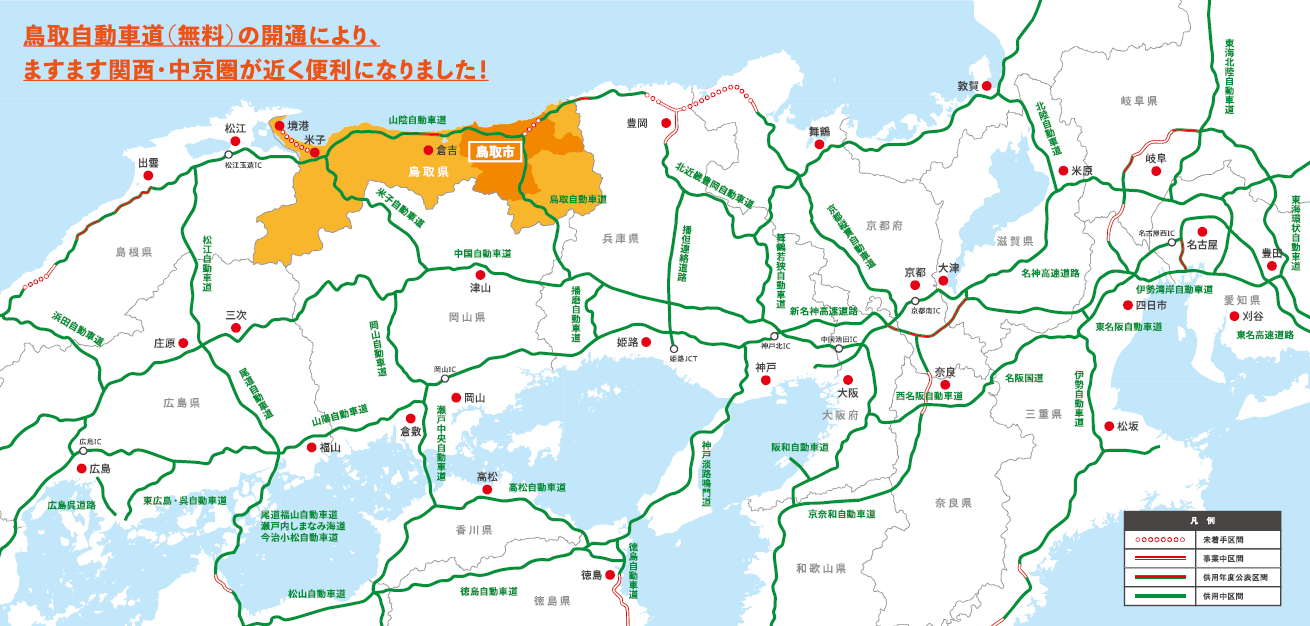 中国自動車道佐用JCTから鳥取ICまでを結ぶ無料の高規格道路が平成25年に全線開通し、鳥取市から関西圏への所要時間が大幅に短縮されたことで、経済・生活・文化などの面で交流が盛んになりました。