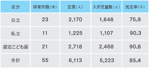 共働き世帯には欠かすことのできない保育所等は概ね充足しており、待機児童0を目指して受け入れ態勢を整えています。