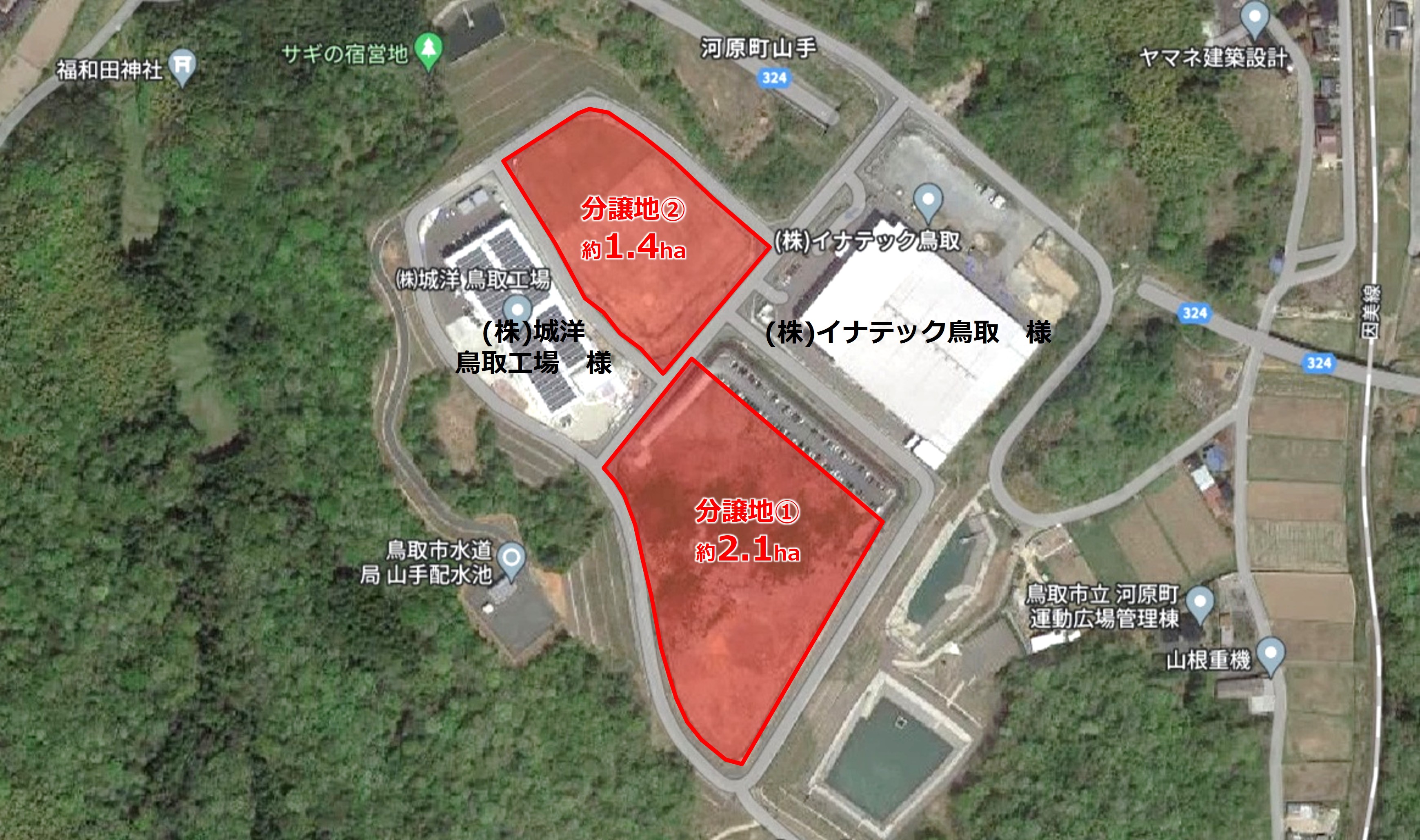 ⿃取⾃動⾞道河原I.Cから約1kmの距離であり、交通アクセスに優れた⼯業団地です。