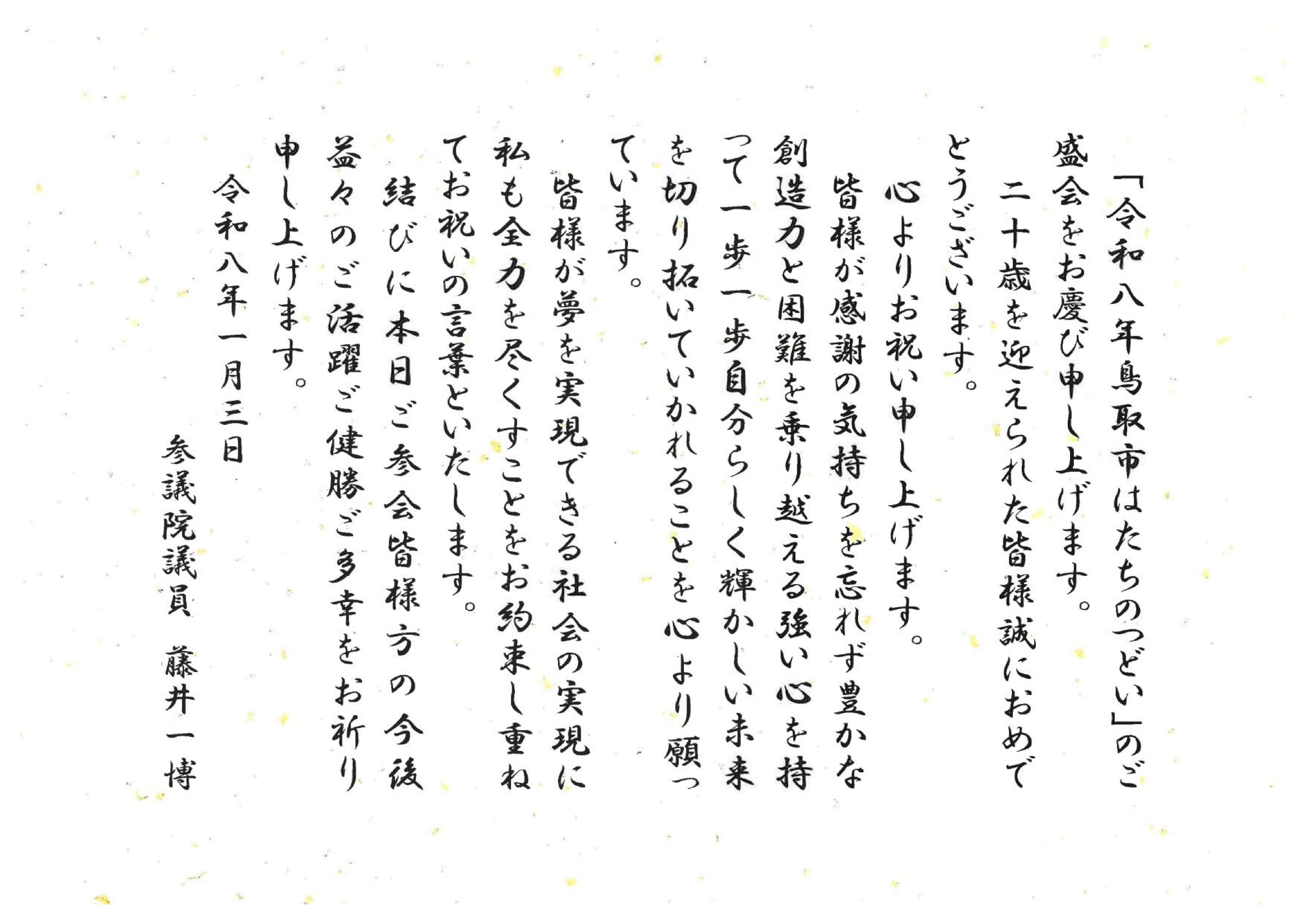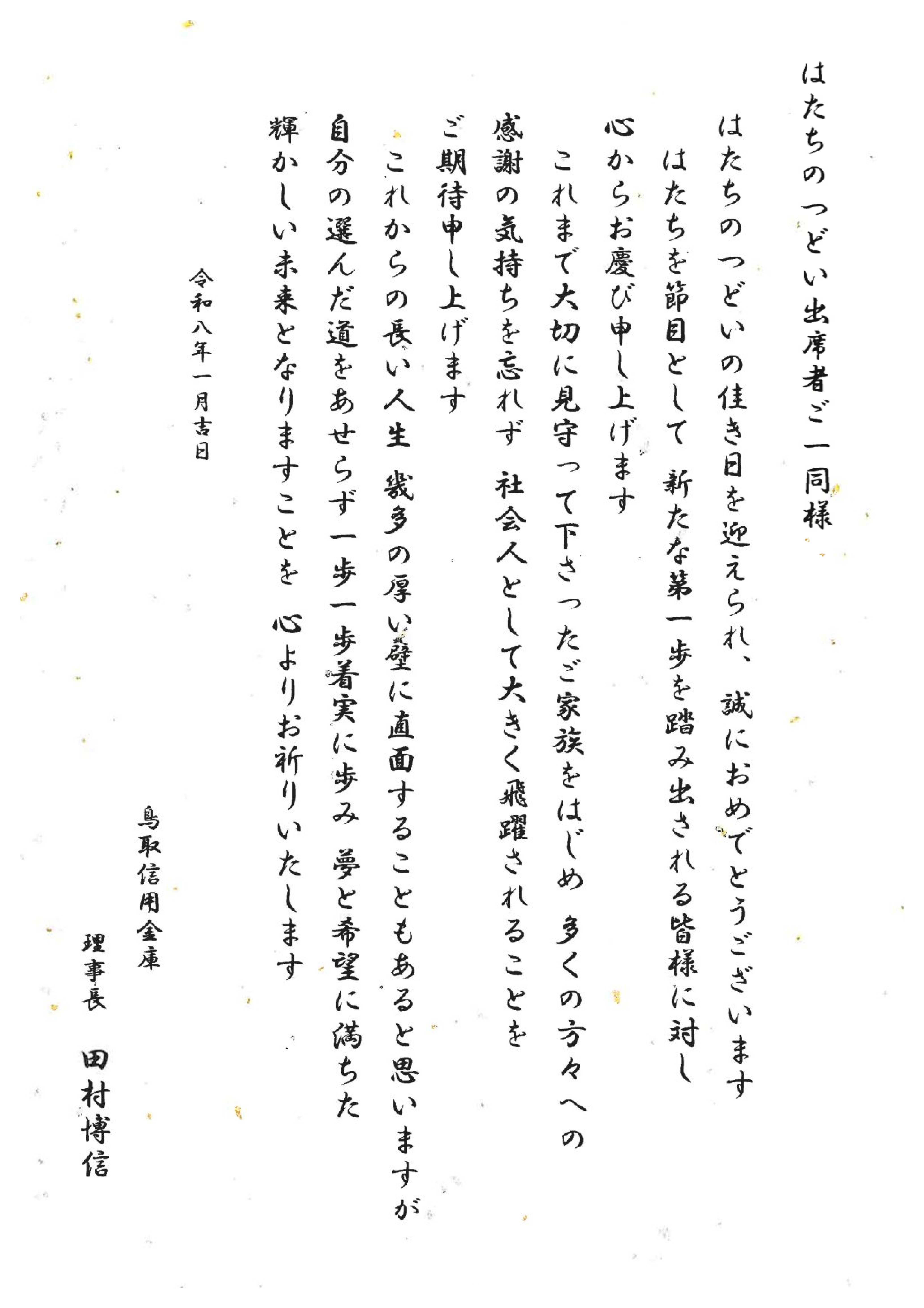 ・鳥取信用金庫 理事長 田村 博信 様からの祝電