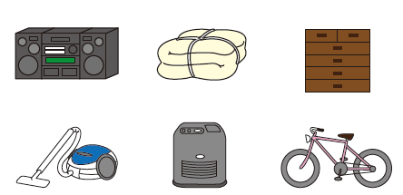 掃除機そうじき、扇風機せんぷうき、石油 せきゆストーブ すとーぶ、自転車 じてんしゃ、たんす、電子 でんしレンジ れんじ、ソファー そふぁー、いす、机 つくえなど