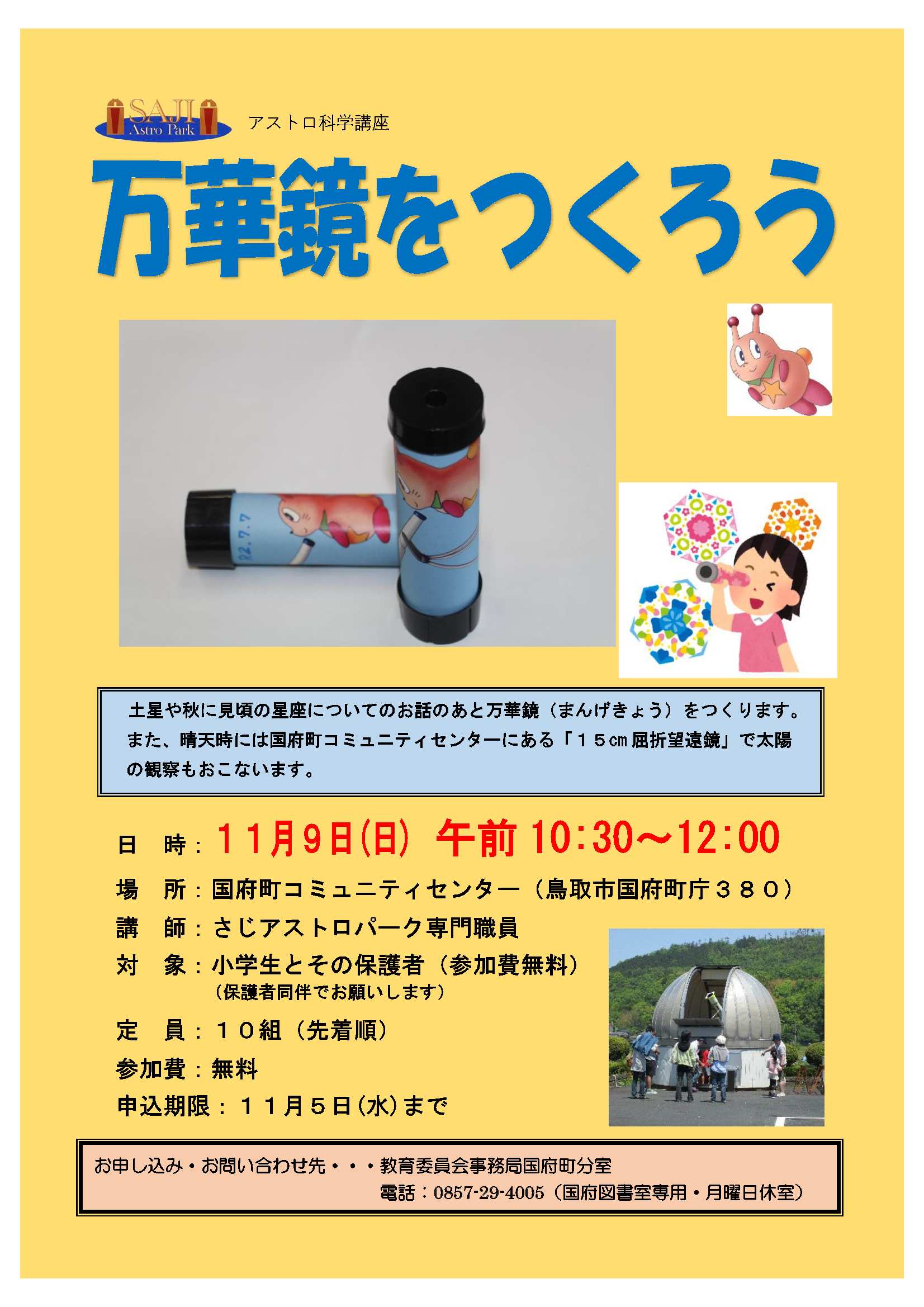 小学生を対象にアストロパーク職員による「アストロ科学講座」を開催します。今回の講座では土星や秋に見ごろを迎える星についてのお話やキットを使って「万華鏡」を作ります。