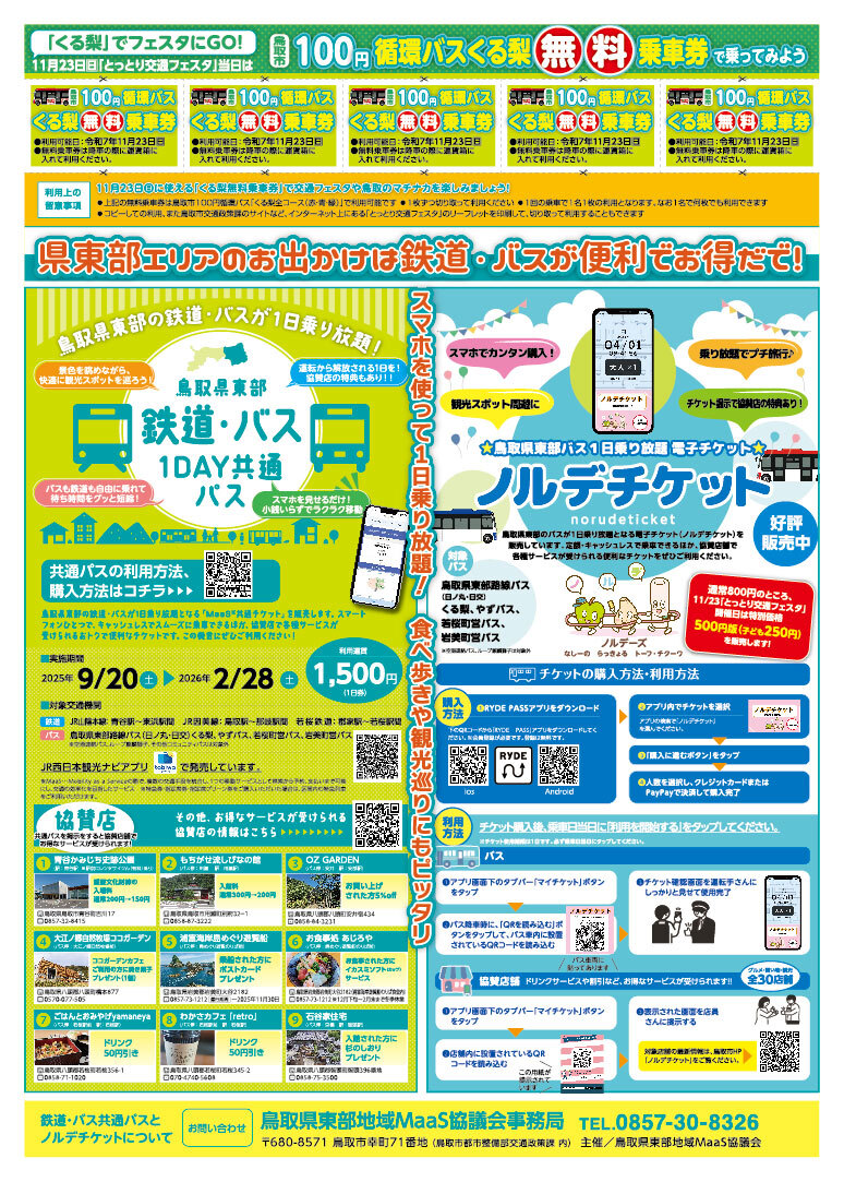 また、今年度のとっとり交通フェスタではくる梨の無料乗車券がリーフレットに付いているほか、ノルデチケットがイベント当日に限り特別価格で利用できるので、実際に公共交通機関に乗ってみてください♪