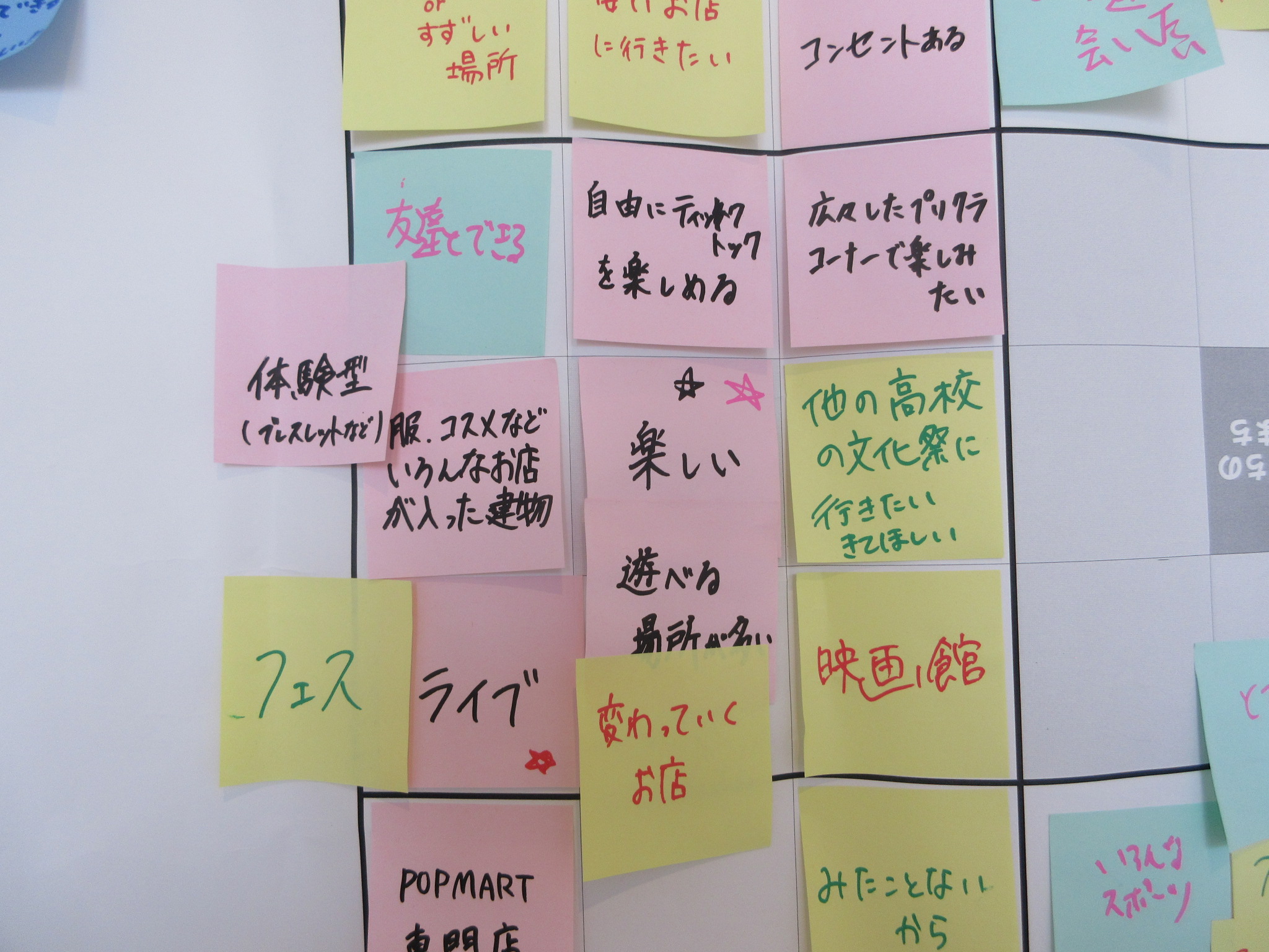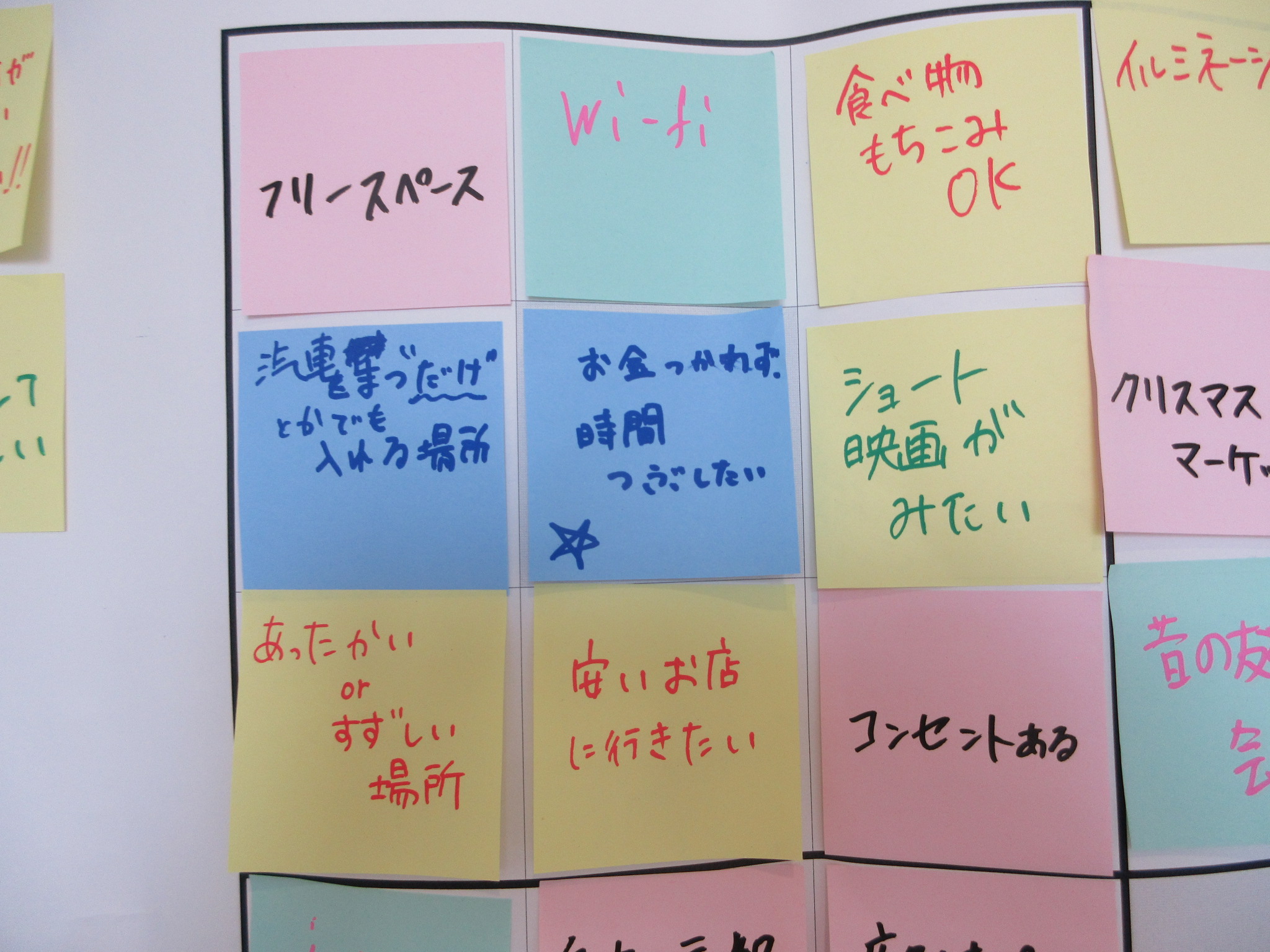 この度は、意見交換に参加していただきありがとうございました。「誰とどんなことをしたい?」という視点でまちを考えていただき、友達と快適に楽しんで過ごせる空間への意見が多くあったように感じます。他にも、中学校の時の友達と会うきっかけになる場があるといいといったアイデアもいただきました。