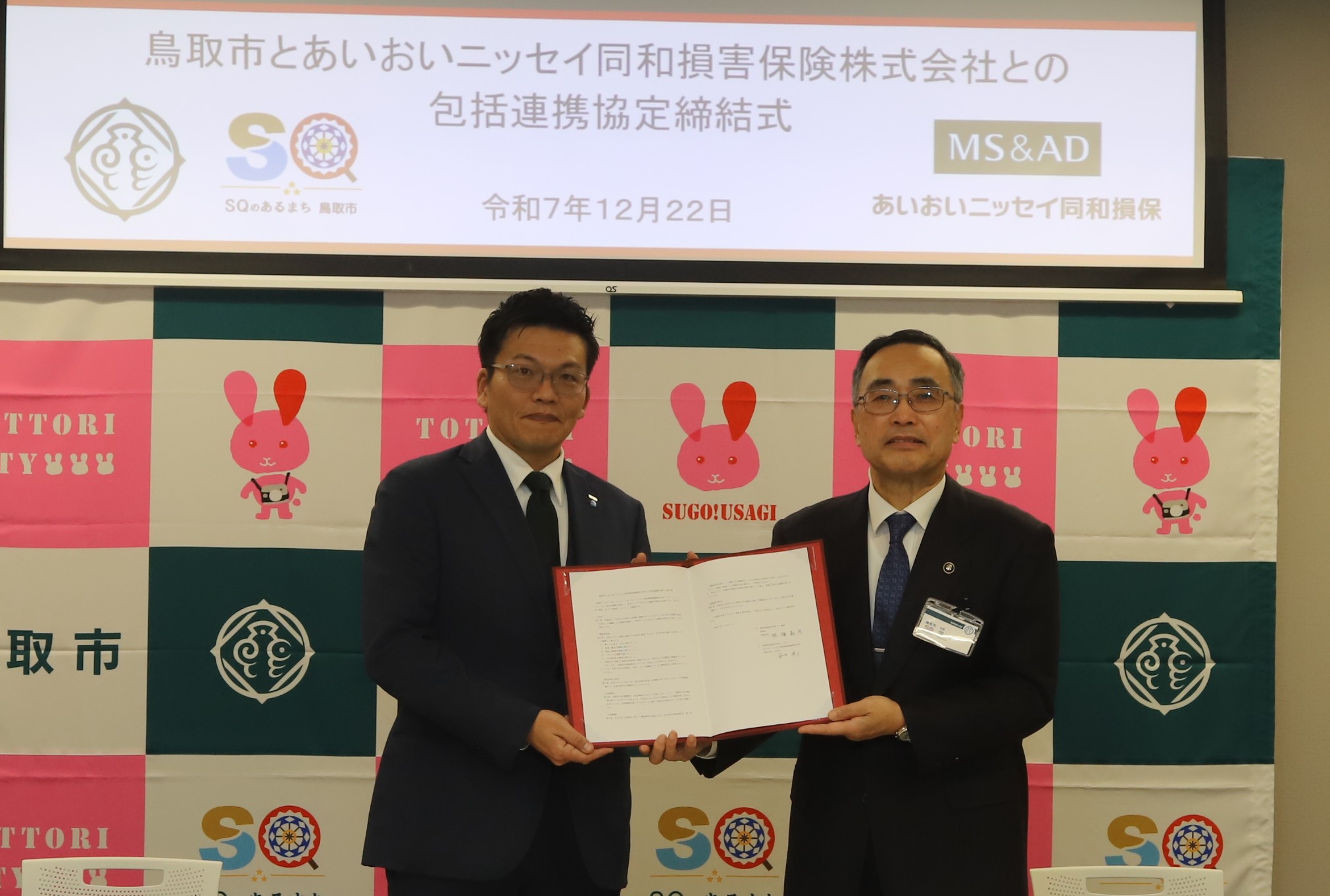 本市とあいおいニッセイ同和損害保険株式会社は、相互の連携を強化し、市民サービスの向上と地域の活性化を図ることを目的に、幅広い分野で連携する「包括連携協定」を令和7年12月22日(月)に締結しました。この協定締結を契機に、お互いの資源を有効活用し、協働による活動を推進することで、本市の振興と発展に取り組んでまいります。