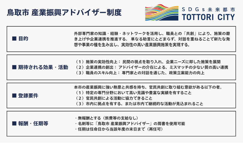 「鳥取市 産業振興アドバイザー制度」を創設 ~第1号は株式会社Dooox 浅香 豪(あさか たける) 氏を認定~登録日: