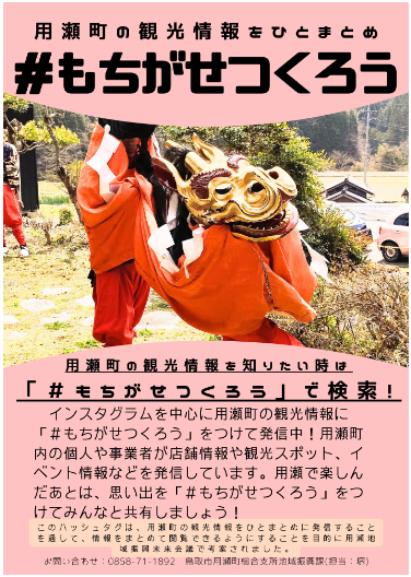 個人や団体で活用されているSNSで用瀬町の観光情報発信をする際に、「#もちがせつくろう」をつけての投稿のご協力をお願しています。